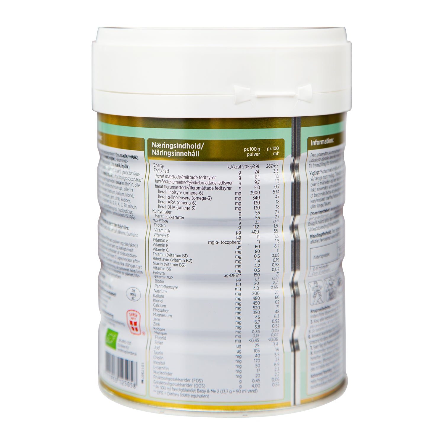 Arla Baby & Me 2 600g. Skummjölken och grädden som används i Baby & Me Organic kommer från utvalda danska kor med A2A2-egenskaper. För att producera 100 g pulver används 120 g A2-mjölk.
