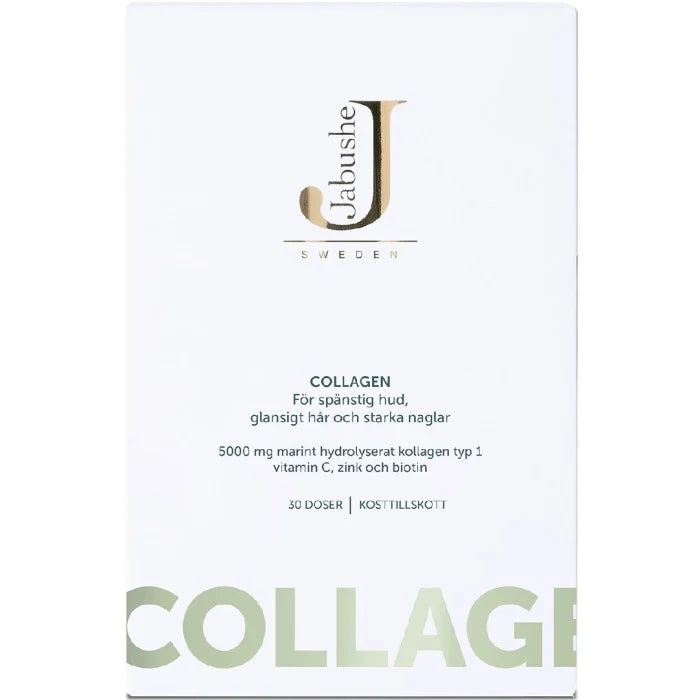 Jabushe Collagen är ett kosttillskott för hud, hår och naglar. Jabushe Collagen har en specialkomponerad formula med kollagen, vitaminer och mineraler för att vara ett komplett näringstillskott för hud, hår och naglar och ett komplement till den dagliga hudvårdsrutinen. Jabushe Collagen innehåller 5000 mg lågmolekylärt marint kollagen per dagsdos, och innehåller den rekommenderade dagsdosen av C-vitamin.